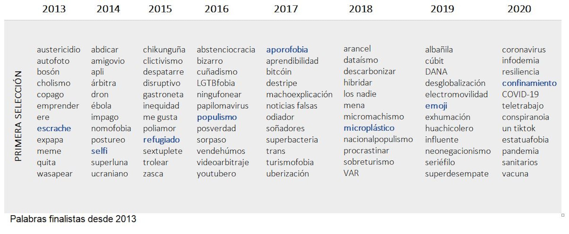 Nos vienen a decir que estos años han estado marcados por la situación económica (emprender, austericidio, copago, quita, ere, impago, bitcóin, arancel, desglobalización); por internet, las redes sociales y la informática (autofoto, wasapear, meme, apli, nomofobia, clictivismo, me gusta, trolear, ningufonear, youtubero, emoji, influente, un tiktok); por la tecnología (videoarbitraje, VAR, dron, electromovilidad); por el deporte (cholismo, árbitra, sextuplete, videoarbitraje, VAR, superdesempate) y por la ciencia (bosón, superluna, papilomavirus, superbacteria, DANA, COVID-19, ébola, coronavirus).