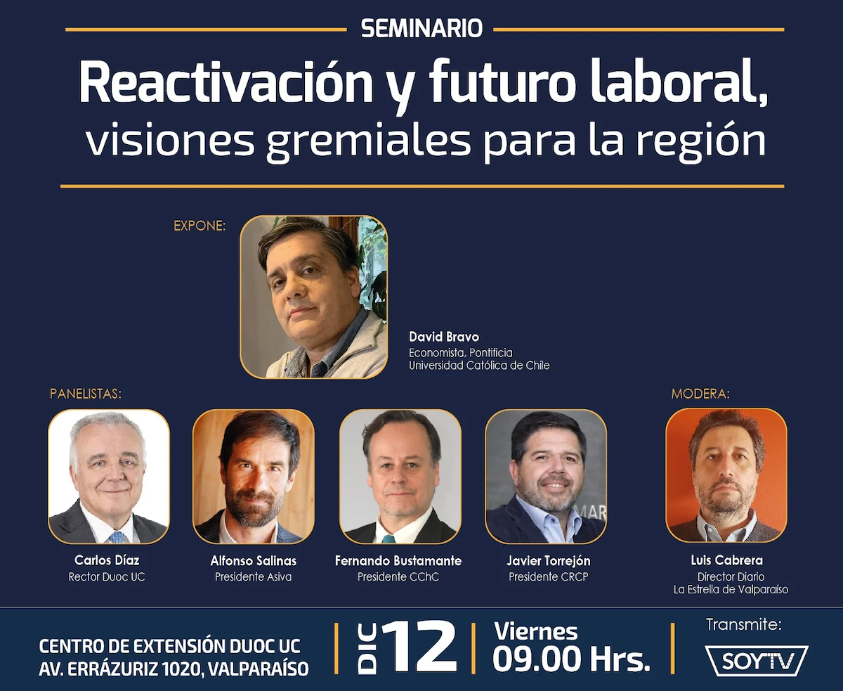 La instancia, organizada por Duoc UC Valparaíso en el marco de sus 50 años y en colaboración con El Mercurio de Valparaíso, contará con la exposición del economista David Bravo, especialista en temas de empleo. Además, el panel de conversación estará integrado por el rector de Duoc UC, Carlos Diaz, y las máximas autoridades de tres de las principales asociaciones gremiales del país: Alfonso Salinas, presidente de la Asociación de Empresas Región de Valparaíso (Asiva); Fernando Bustamante, presidente Cámara Chilena de la Construcción (CChC) Valparaíso; y Javier Torrejón, presidente Cámara Regional del Comercio de Valparaíso (CRCP).