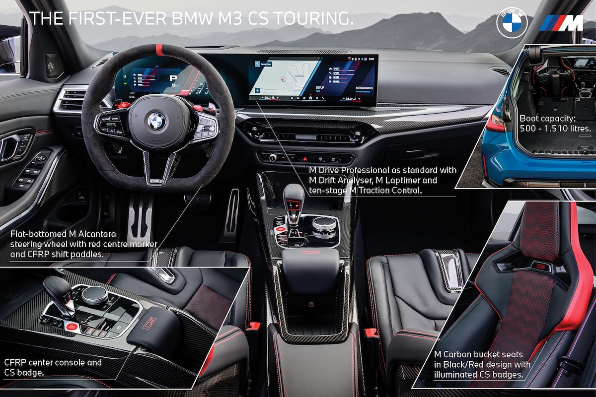 El gran giro de este lanzamiento lo da el BMW M3 CS Touring. Aquí BMW mezcla dos mundos: el de un auto familiar (tipo station wagon) con el de un superdeportivo.