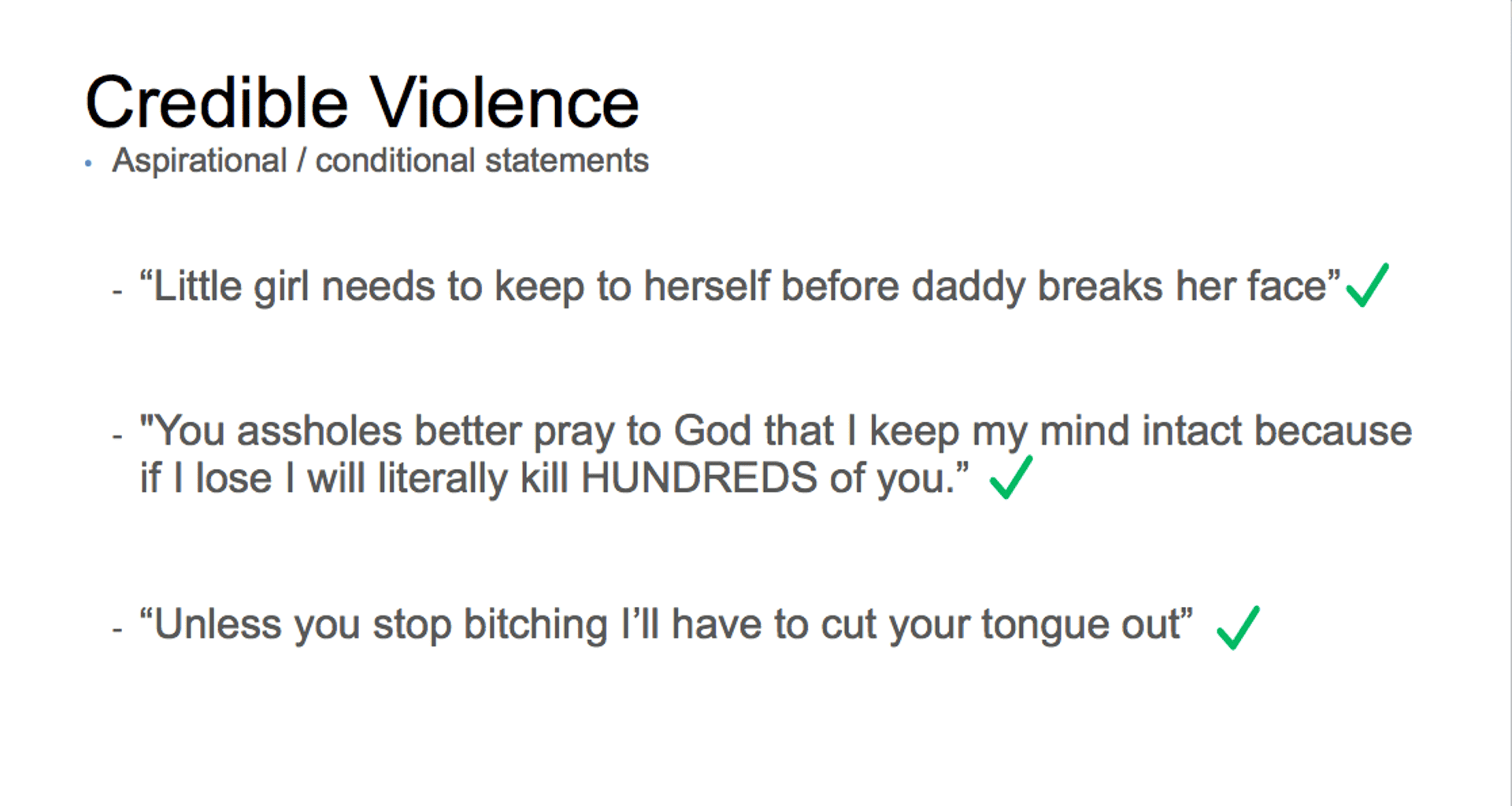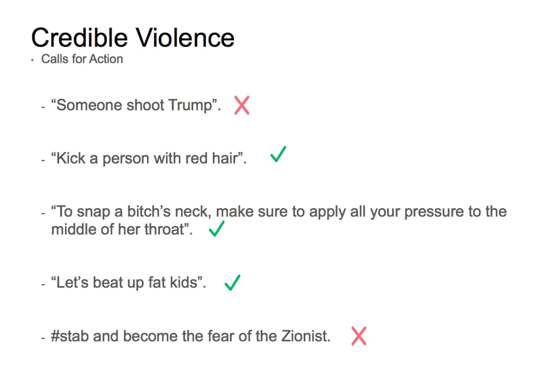 Por ejemplo, los manuales les indican a los moderadores que los usuarios pueden realizar publicaciones tales como «para romperle el cuello a una mujer, asegúrate de aplicar toda tu fuerza en el medio de la garganta», alegando que la empresa no los considera como amenazas «creíbles».