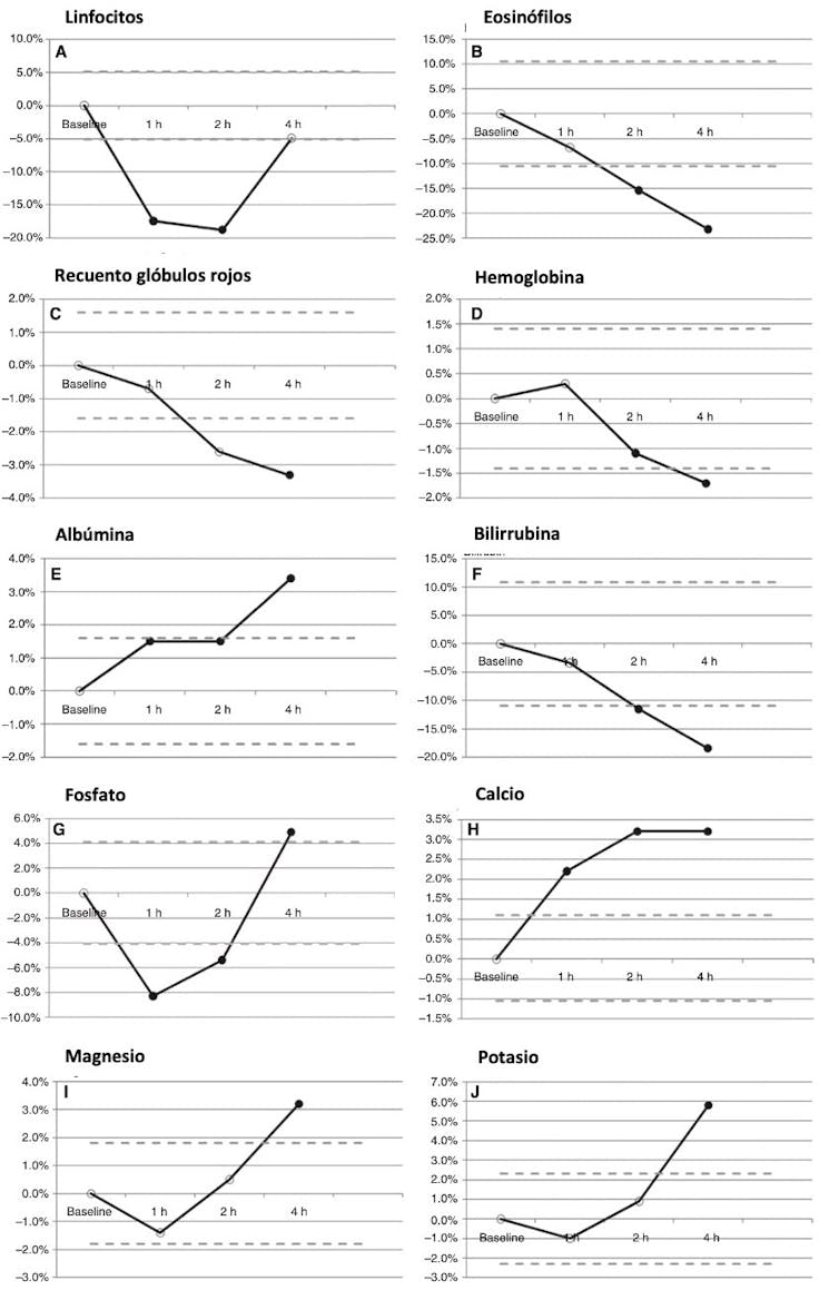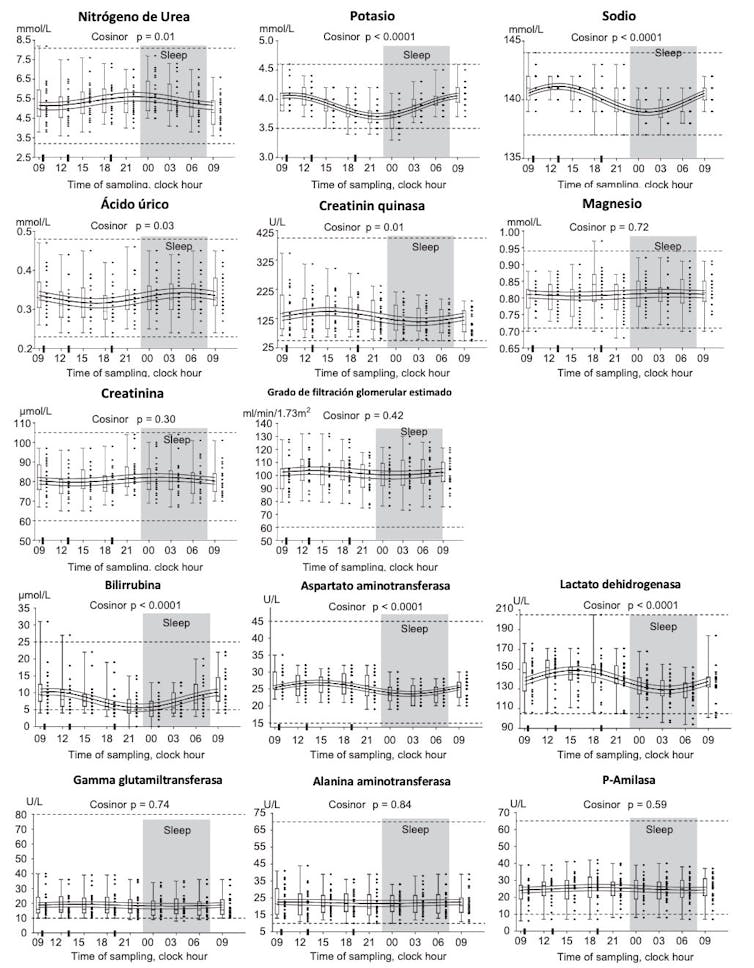 Así, se observó que el potasio, el sodio, la creatin-quinasa, la bilirrubina, la lactato-dehidrogenasa, el ácido úrico y otros oscilan significativamente a lo largo del intervalo de 24 horas. Sólo unos pocos, como el magnesio o la creatinina, no varían significativamente.