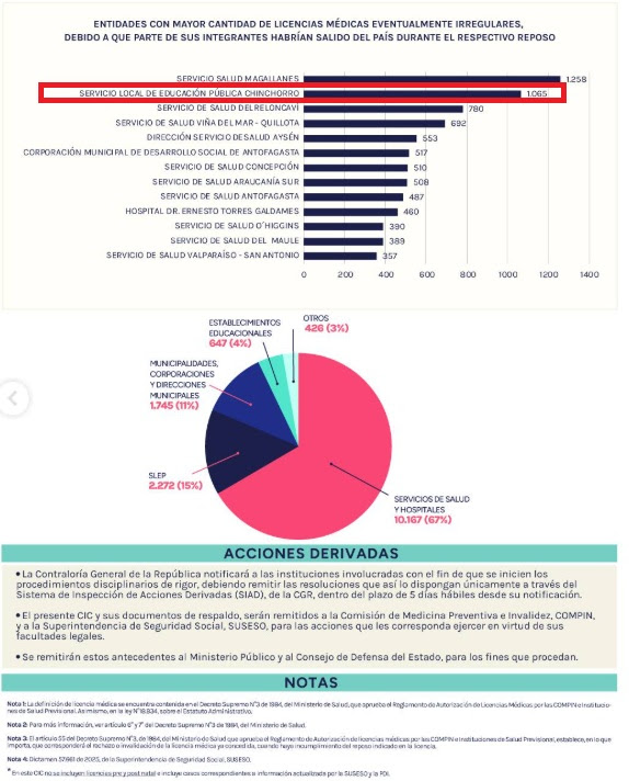 - En la primerísima nota un tema preocupante: el Servicio Local de Educación Pública Chinchorro (SLEPCh) inició 511 sumarios por uso de licencias médicas para salir del país. Dentro de estos hay un número importante de profesores que según el Estatuto Docente solo pueden ser absueltos o destituidos, ya que esa normativa no contempla medidas sancionatorias intermedias.