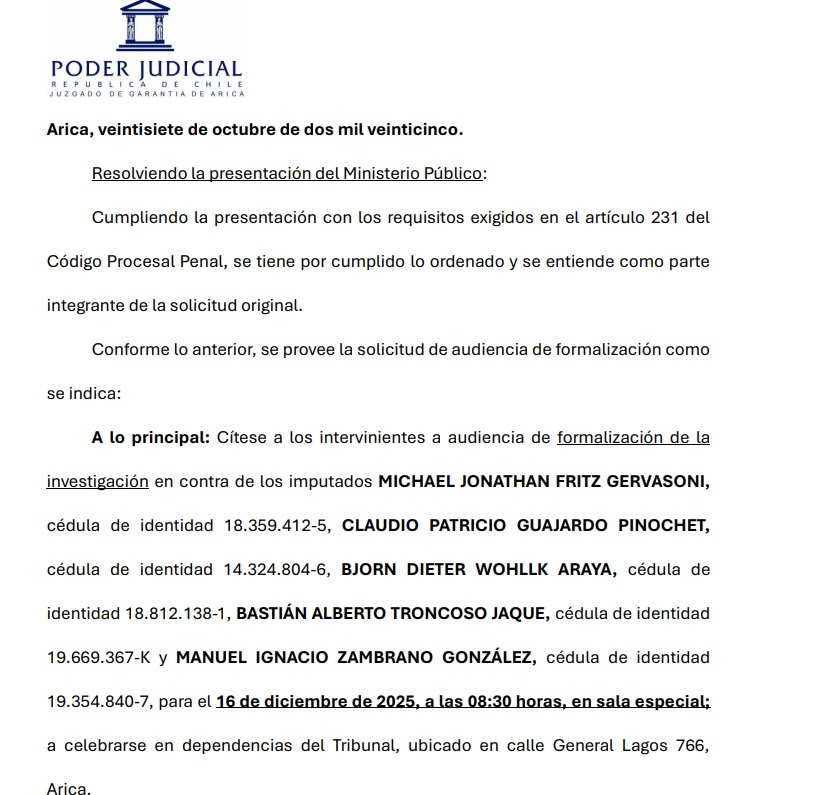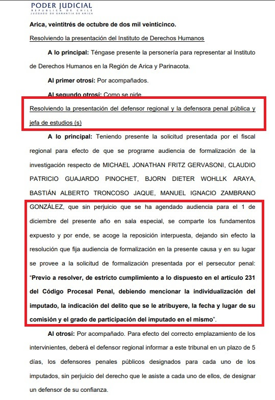 - Incluimos en esta edición el traspié sufrido por la Fiscalía Regional de Arica y Parinacota al anunciar que el 1 de diciembre formalizaría a cinco militares por el Caso Franco Vargas. La audiencia quedó en suspenso debido a que la Defensoría Penal Pública ganó un recurso donde impugnó la solicitud del órgano persecutor, evidenciando que había errores en su presentación al no detallar antecedentes específicos de los delitos imputados.