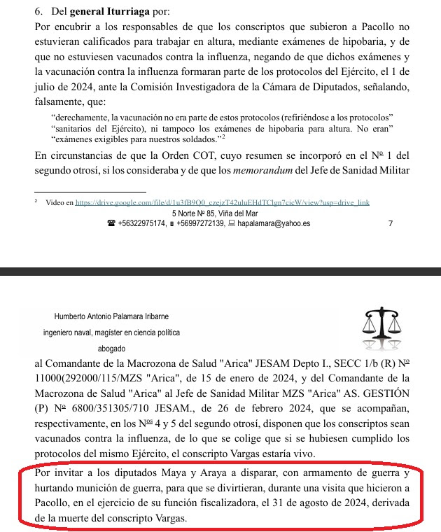 En el documento, la defensa de Guajardo cuestionó la fiscalización que realizaron ambos parlamentarios el 31 de agosto del año pasado al Centro de Entrenamiento Militar de Pacollo, donde falleció Franco Vargas. En la acción judicial pidió que se investigara al comandante en jefe del Ejército «por invitar a los diputados Malla y Araya a disparar, con armamento de guerra y hurtando munición de guerra, para que se divirtieran, durante una visita que hicieron a Pacollo, en el ejercicio de su función fiscalizadora, el 31 de agosto de 2024, derivada de la muerte del conscripto Vargas».