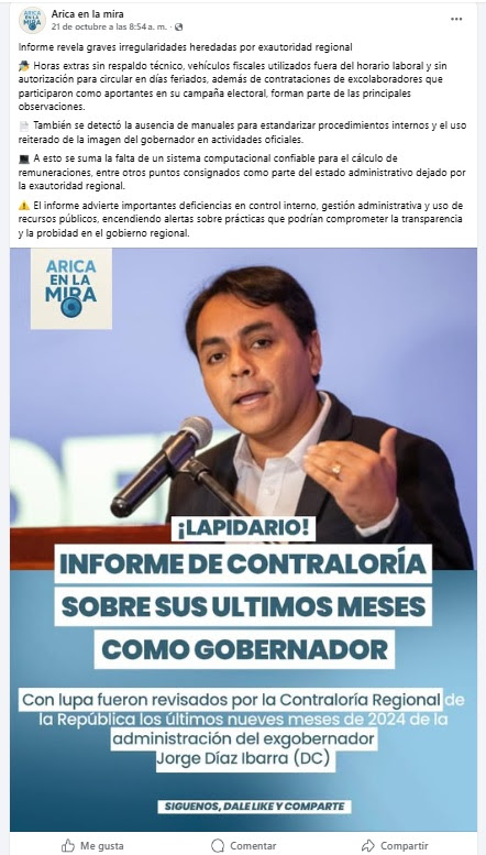 - La campaña parlamentaria no para en la región. En este newsletter reporteamos el fuego cruzado que hay en la lista oficialista, donde el candidato a diputado y exgobernador regional Jorge Díaz Ibarra denunció una maquinación del Partido Socialista (PS) para desprestigiarlo, usando una cuenta de Facebook del alcalde Orlando Vargas Pizarro, cuya hija y la directora de la Dideco se presentan como postulantes a senadora y a diputada.