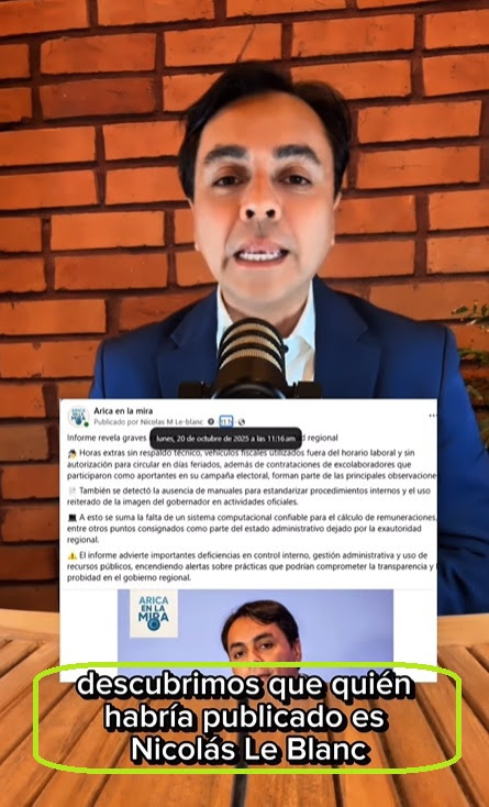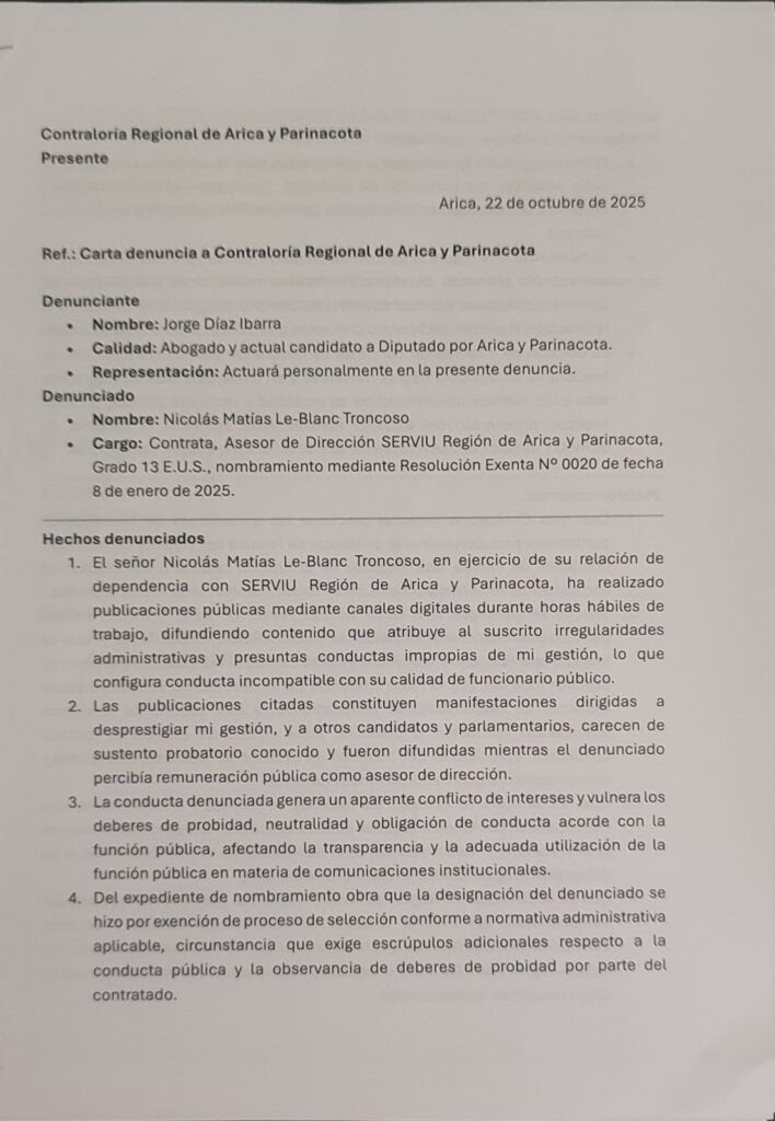Jorge Díaz no se quedó solo con la «videofuna». Fue más allá y presentó una denuncia en la Contraloría Regional de la República en contra de Nicolás Le Blanc Troncoso, acusándolo de haber publicado en «Arica en la Mira» durante su horario laboral en el Serviu.