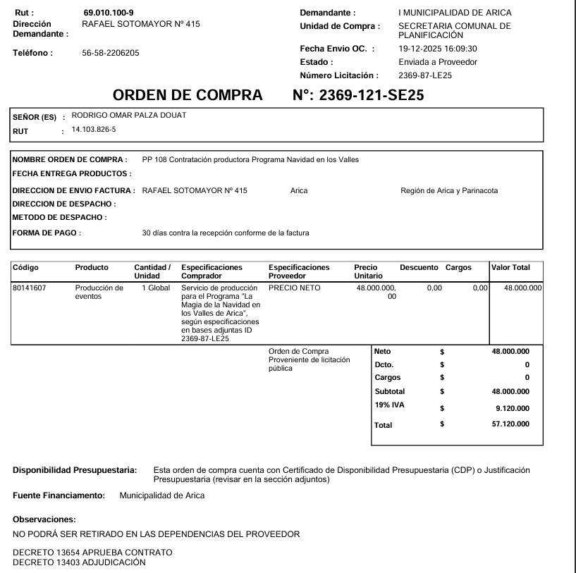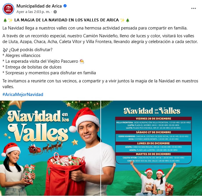 - ¡Lamentable! El Viejito Pascuero prometido por la Municipalidad de Arica para los niños de Villa Frontera y el valle de Lluta no llegó. En esta nota les contamos lo que pasó en la primera jornada de la gira «Navidad en los valles del municipio», donde el productor contratado por el municipio por $ 57 millones no acudió con el carro navideño pactado, generando molestia en esos sectores.