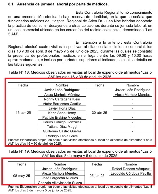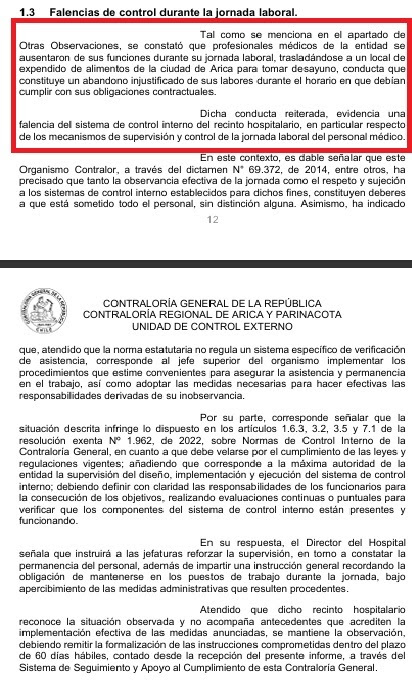 Se trata del Informe Nº 318 del 13 de octubre de 2025 que llegó generosamente a nuestras manos. Hasta hoy se mantiene una antigua observación: que los facultativos, a diferencia del resto del personal, no tienen un control horario que permita fiscalizar el cumplimiento de su jornada. Por alguna razón que se desconoce hasta hoy, los médicos gozan de un trato especial que “irrita” al resto de los funcionarios.