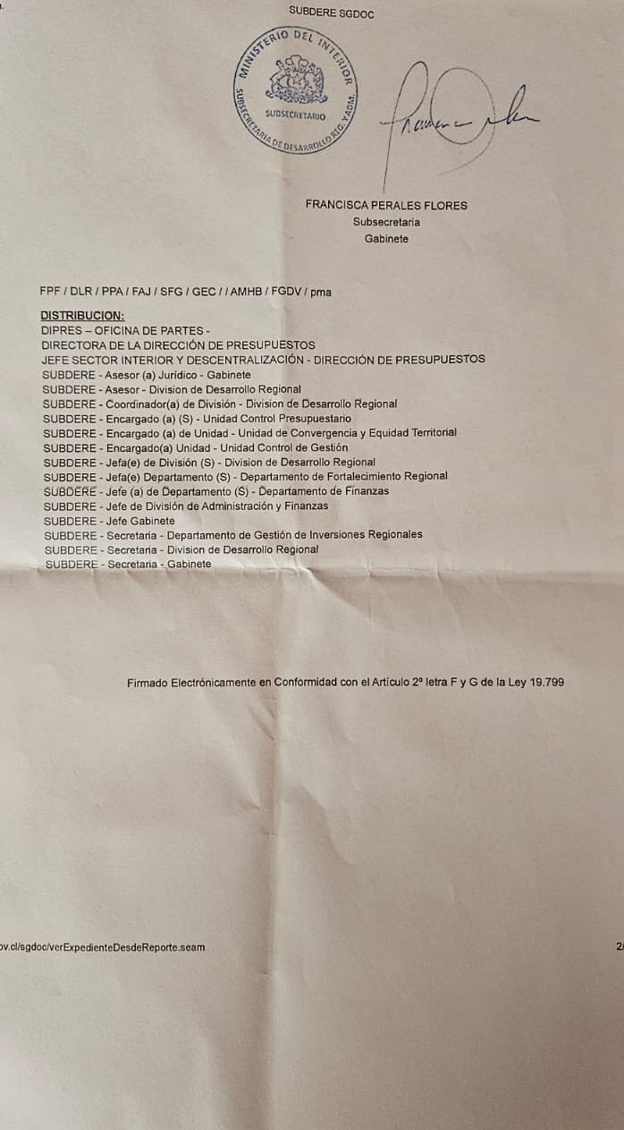 El oficio de la Subdere saliente que asigna los recursos a tres regiones.