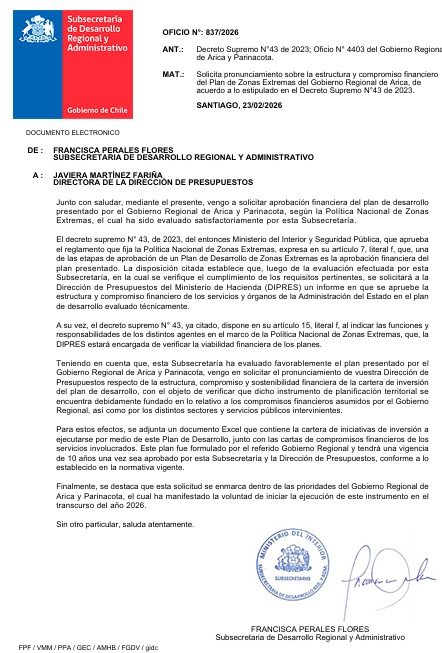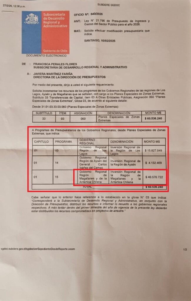 - Se trata del Oficio N° 640/2026 del 10 de febrero pasado que fue enviado por la exsubsecretaria de Desarrollo Regional, Francisca Perales, a la directora de Presupuestos, Javiera Martínez , en el que se reservaban $ 60.536 millones, es decir, un 86% de los $ 69.000 millones disponibles este año para las regiones de Magallanes y de la Antártica Chilena, de Los Lagos y de General Carlos Ibáñez del Campo. A nivel político, la decisión fue calificada como la “emboscada magallánica”, debido a que hasta el término del Gobierno saliente nunca hubo una asignación de fondos de este plan a Arica y Parinacota.