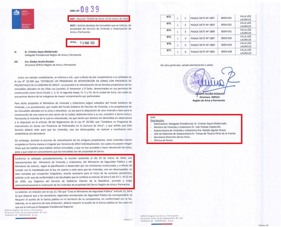 El mismo día del contacto por Teams despachó la Resolución N° 839 de 29 páginas a la Delegación Presidencial Regional (DPR). Este trámite era vital para activar el procedimiento, dado que así lo instruyó un fallo de la Corte Suprema en 2017, cuando el gobernador provincial de Arica, Ricardo Sanzana, hizo el último intento por efectuar un desalojo masivo, el cual fue rechazado debido a que el Serviu -como propietario de las casas- era la entidad que debía pedir la erradicación con auxilio de la fuerza pública (ver nota).