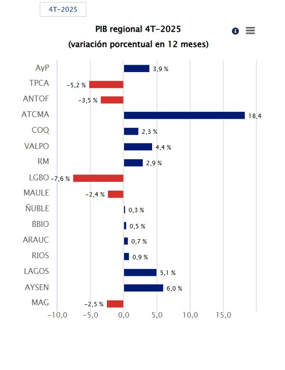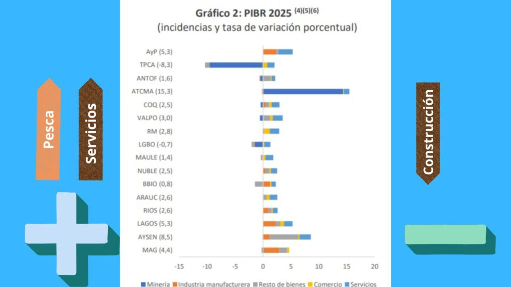 Una sorpresiva radiografía entregó el último Informe del Banco Central sobre el Producto Interno Bruto Regional (PIBR). El análisis reveló que la economía regional creció un 5,3% durante el año 2025, impulsada “por la industria pesquera, los servicios personales y la pesca, mientras que la construcción restó parcialmente al resultado”.