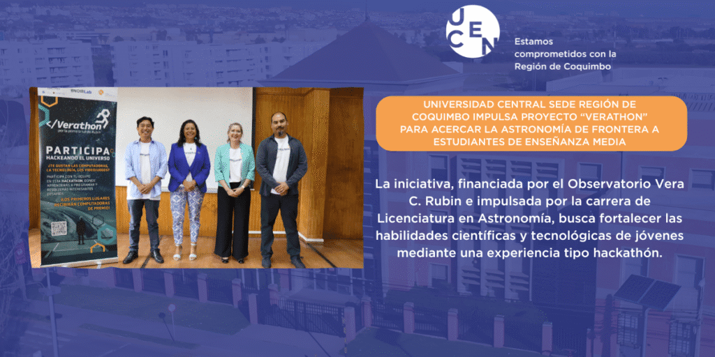 En la sede Región de Coquimbo de la Universidad Central se realizó el lanzamiento del proyecto Verathon: por la primera luz del Observatorio Vera C. Rubin, liderado por el académico e investigador Dr. Cristian Vega Martínez. La iniciativa busca potenciar las habilidades estratégicas de estudiantes de enseñanza media a través de una competencia colaborativa, acercando la ciencia y la innovación tecnológica a las nuevas generaciones.
