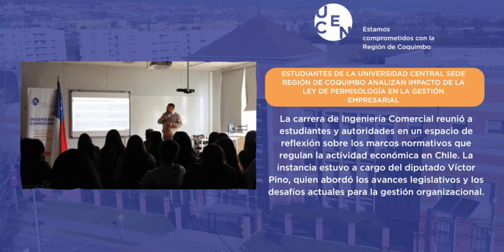 El pasado 13 de noviembre se realizó la charla “Ley de Permisología: Desafíos y oportunidades para la gestión empresarial”, organizada por la carrera de Ingeniería Comercial de la Universidad Central. La actividad permitió que estudiantes de pregrado profundizaran en los marcos normativos vigentes y comprendieran cómo estos influyen en los procesos de gestión dentro de las organizaciones.
