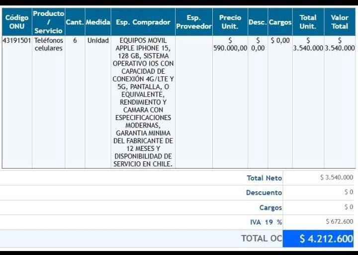 En paralelo, se conoció la adquisición de seis equipos iPhone 15 de 128 GB, con un valor unitario de $590.000 más IVA, los que totalizan la cifra de $ 4.212.600.