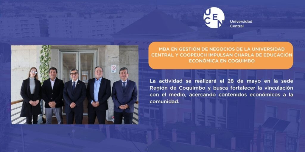 La actividad se llevará a cabo el 28 de mayo en el Aula Magna de la Universidad Central sede Región de Coquimbo y contará con la participación de Felipe Ramírez, economista jefe de COOPEUCH. Al respecto, el Director del MBA, Jaime Alonso destacó que estas iniciativas “fortalecen el vínculo con el entorno y aportan al desarrollo del territorio desde una mirada formativa y participativa”. Por su parte, Ricardo Franco señaló que la iniciativa apunta a convocar a empresarios, autoridades y ciudadanía, fortaleciendo el relacionamiento y el acceso a información relevante.