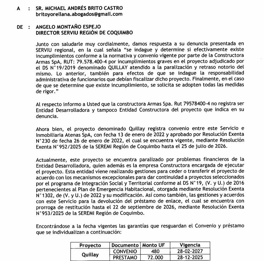 - La denuncia a la que tuvo acceso Aquí Coquimbo, ingresada el 3 de octubre de 2025, apunta a irregularidades en la ejecución del proyecto “Quillay”, del programa DS19, que hoy registra apenas un 8% de avance y permanece paralizado.