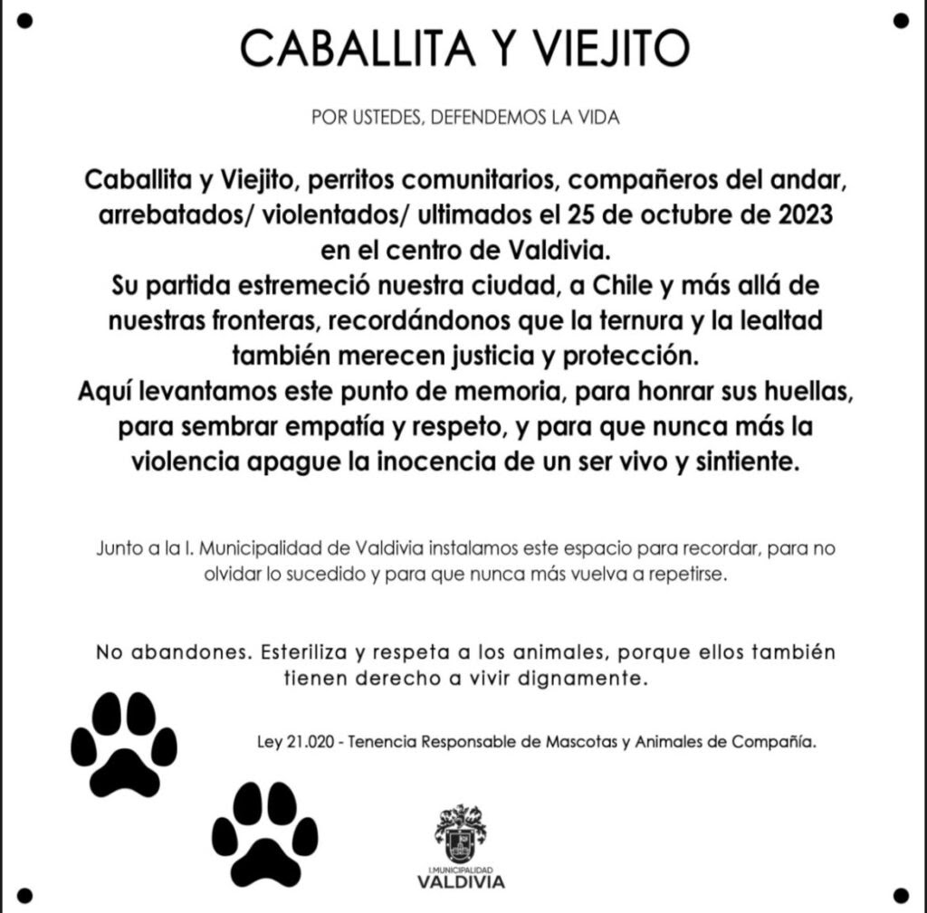 - Caballita y Viejito, los dos perros comunitarios asesinados e inhumados en el centro de Valdivia, tendrán placa y esculturas en el Paseo Camilo Henríquez. La placa, con un costo cercano a $ 1,5 millones, marca la primera etapa de una decisión tomada con el municipio puesto en jaque: agrupaciones animalistas mantuvieron casas de perros y lienzos en el lugar, se negaron a retirarlos y forzaron un acuerdo, mientras el municipio denunciaba incivilidades que afectaban a locatarios del sector. La pregunta que abrimos: ¿qué precedente instala para la política urbana priorizar un memorial a estas mascotas comunitarias cuando no existe una sola placa recordatoria de los más de 1.600 muertos del terremoto y tsunami de 1960?