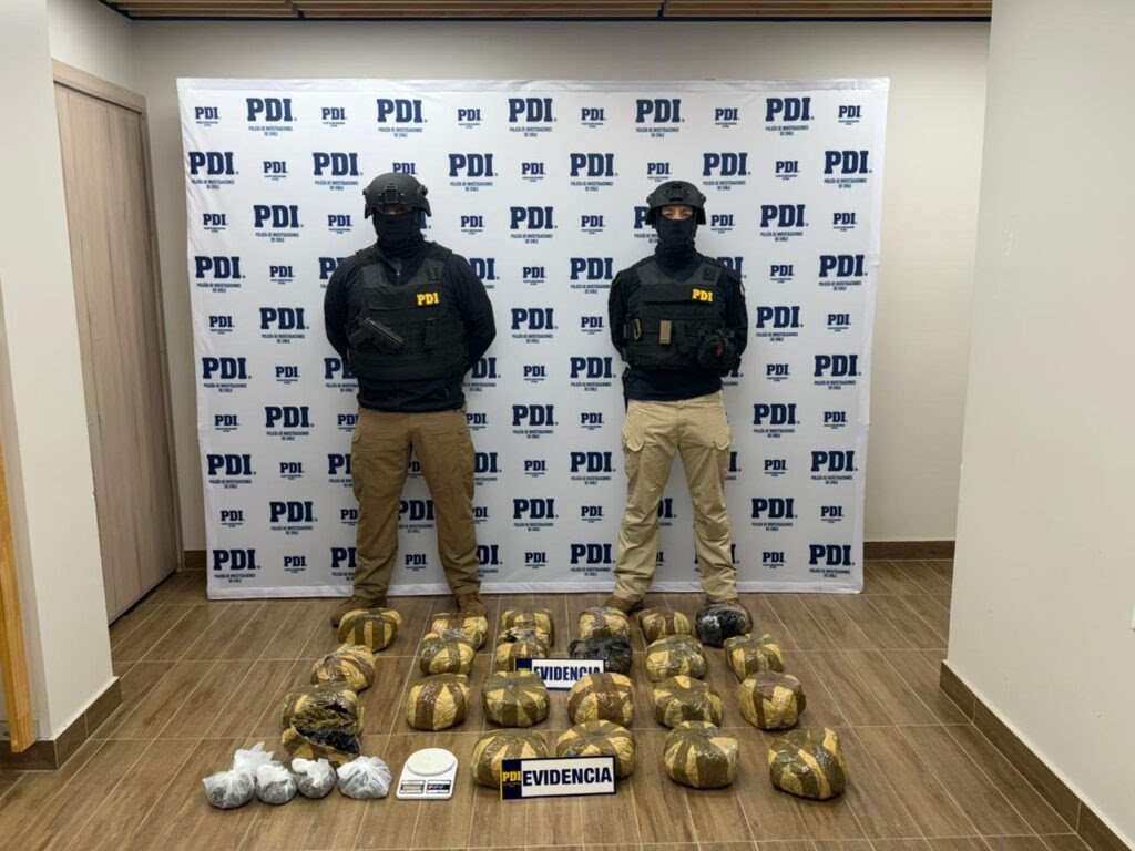 Ese fue el primer caso. El segundo fue de otra escala. Una investigación de la Unidad de Análisis Criminal y Focos Investigativos, de la fiscalía, ECOH y la BIPE de la PDI, terminó con tres detenidos, tres domicilios allanados y 22,8 kilos de marihuana incautados. La droga había sido trasladada desde Santiago. El avalúo informado supera los $ 114 millones. Los tres imputados quedaron en prisión preventiva y el tribunal fijó 110 días de investigación.