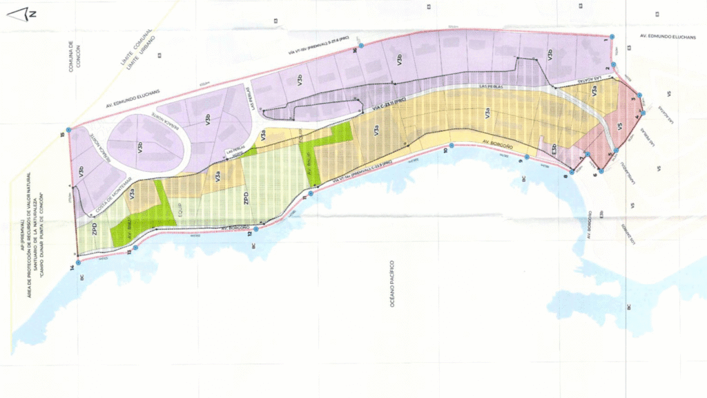 El seccional se extiende desde el límite con Concón hasta la altura del mirador de la playa Cochoa y establece tres nuevos sectores: las áreas V3-a y V3-b, que admiten viviendas de hasta tres y ocho pisos; y la Zona de Paisaje Dunas, que prohíbe expresamente el uso residencial, autoriza equipamiento cultural, científico o deportivo de hasta dos pisos, y espacios públicos y áreas verdes.