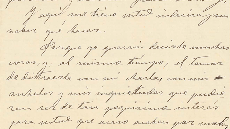 (…) aquí me tiene usted indecisa y sin saber qué hacer. Porque yo querría decirle muchas cosas, y, al mismo tiempo, el temor de distraerle con mi charla, con mis anhelos y mis inquietudes que pudieran ser de tan poquísimo interés para usted que acaso acaben por molestarle, me impide ser tan espontánea como yo quisiera.“ (Ángela Barco).