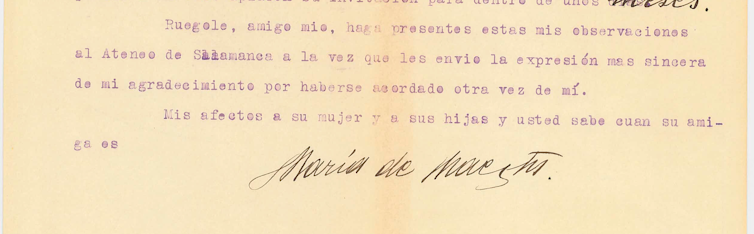 ”(…) Ruégole, amigo mío, haga presentes estas observaciones al Ateneo de Salamanca a la vez que les envío la expresión más sincera de mi agradecimiento por haberse acordado de mí. Mis afectos a su mujer y a sus hijas y usted sabe cuan su amiga es». (María de Maeztu)