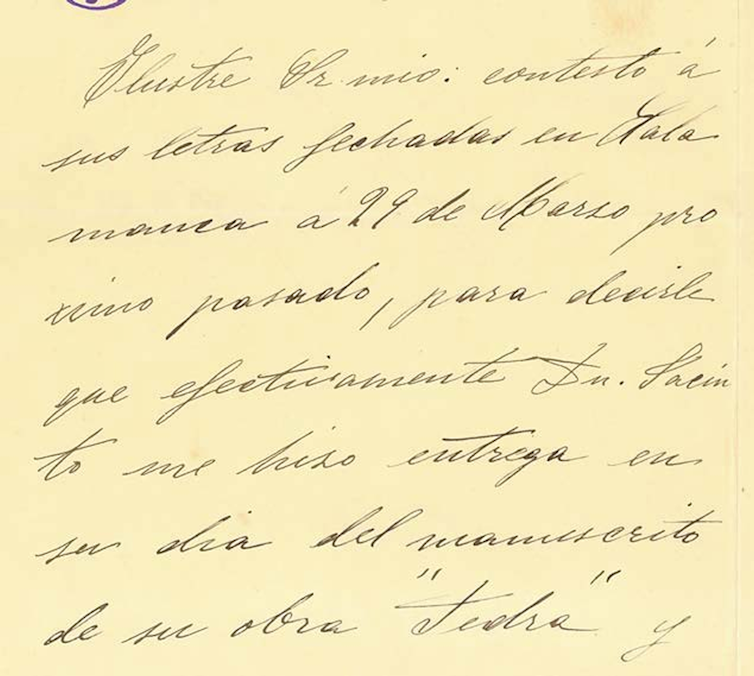 ”(…) Contesto a sus letras fechadas en Salamanca el 29 de marzo próximo pasado, para decirle que efectivamente D. Jacinto me hizo entrega en su día del manuscrito de su obra Fedra.“ (Margarita Xirgu).