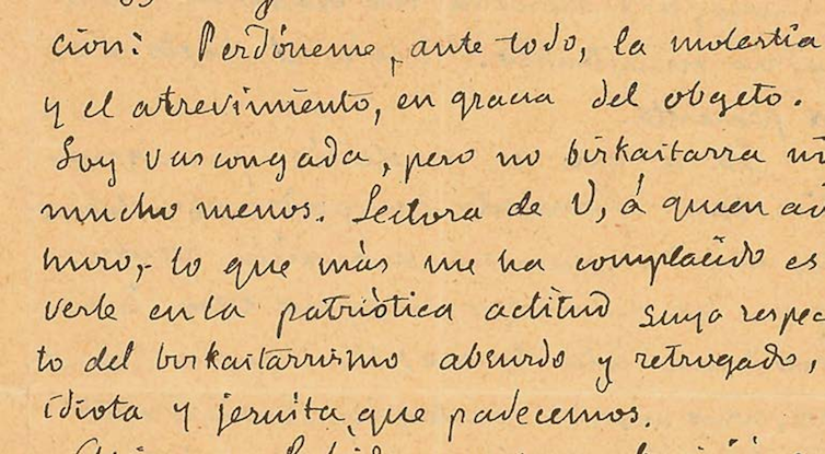 ”(…) Perdóneme, ante todo, la molestia y el atrevimiento, en gracia del objeto. Soy Vascongada pero no Bizkaitarra ni mucho menos. Lectora de Ud. a quien admiro, lo que más me ha complacido es verle en la patriótica actitud suya respecto del Bizkaitarrismo absurdo y retrógrado, idiota y jesuita que padecemos». (Ángela Arancoa)