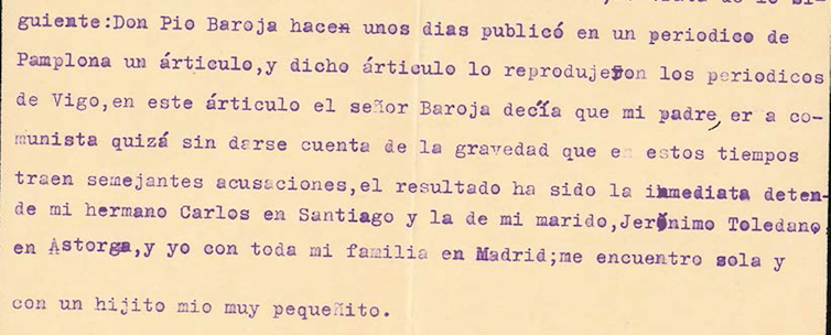 “Don Pío Baroja hace unos días publicó en un periódico de Pamplona un artículo y dicho artículo lo reprodujeron los periódicos de Vigo, en este artículo el Sr. Baroja decía que mi padre era comunista quizás sin darse cuenta de la gravedad que en estos tiempos traen semejantes acusaciones, el resultado ha sido la inmediata detención de mi hermano Carlos en Santiago y la de mi Marido Jerónimo Toledano en Astorga, y yo con toda mi familia en Madrid me encuentro sola y con un hijito mío muy pequeñito.” (Concepción Valle Inclán).
