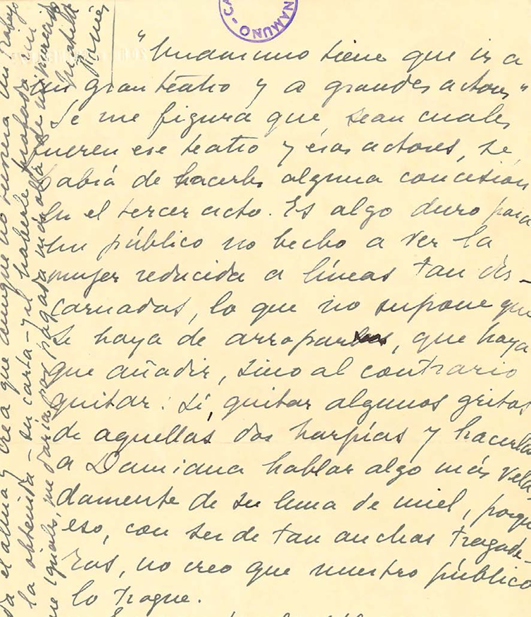 Destacan también aquellas que le escriben en relación a la adaptación de sus obras al cine o al teatro, como es el caso de Mathilde Pomés, Lola Membrives o Carmen Nelken. Entre estas cartas resulta curiosa la enviada por Mathilde Pomés que se atreve, incluso, a aconsejar a Unamuno sobre el tratamiento de alguno de sus personajes, llegando a sugerirle cambios en el guión de la obra.
