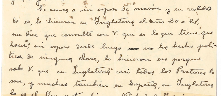 “Se acusa a mi marido de masón y en realidad lo es, lo hicieron en Inglaterra en el año 20 o 21, me dice que consulte con Ud que es lo que tiene que hacer, mi esposo desde luego no ha hecho política de ninguna clase, lo hicieron eso porque sabe Ud que en Inglaterra casi todos los pastores lo son y muchos también en España.” (Enriqueta Carbonell)
