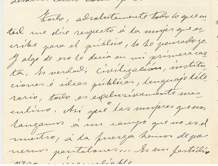 ”(…) Todo, absolutamente todo lo que usted me dice respecto a la mujer que escribe para el público lo he pensado yo. Y algo de eso le decía en mi primera carta. Es verdad; civilización, instituciones e ideas públicas, lenguaje literario todo es exclusivamente masculino. Así que las mujeres que nos lanzamos a un tiempo que no es el nuestro, a la fuerza hemos de ponernos pantalones, es un fastidio, pero es irremediable.“ (Ángela Barco)