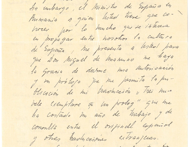 “(…) El Ministro de España en Rumanía a quien usted tiene que conocer por lo mucho que se interesa en propagar entre nosotros la cultura de España, me presenta a usted para que Don Miguel de Unamuno me haga la gracia de darme una autorización y un prólogo que me permita la publicación de mi traducción «Trei Nuvele exemplare si un prolog” que me ha costado un año de trabajo y de consulta entre el oficial español y otras traducciones extranjeras…“ (Gratiana Oniciu)
