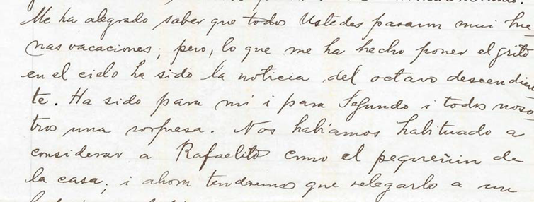 “Me ha alegrado saber que todos ustedes pasan muy buenas vacaciones; pero, lo que me ha hecho poner el grito en el cielo ha sido la noticia del octavo descendiente. Ha sido para mí y para Segundo y para todos nosotros una sorpresa. Nos habíamos habituado a considerar a Rafaelito como el pequeñín de la casa”. (Matilde Brandau)