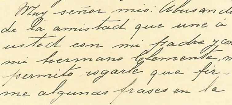 “Muy Señor mío: Abusando de la amistad que une a usted con mi padre y con mi hermano Clemente, me permito rogarle que firme algunas frases.” (Augusta Palma).
