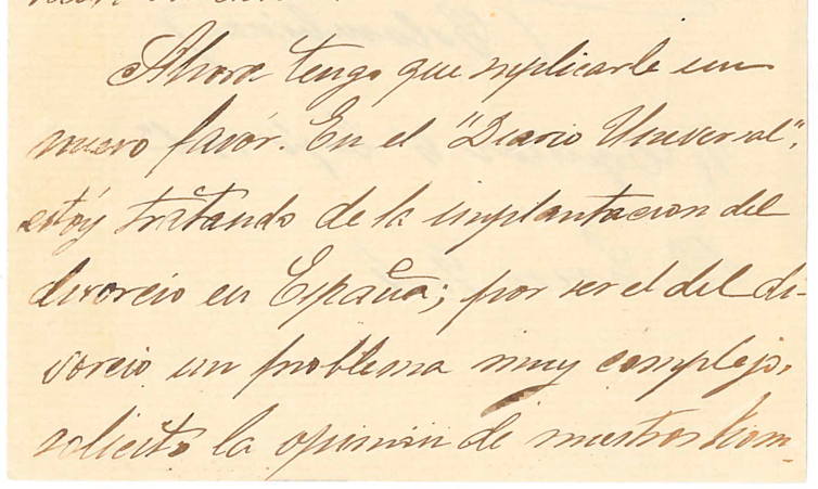 ”(…) Ahora tengo que suplicarle un nuevo favor. En el “Diario universal” estoy tratando de la implantación del divorcio en España, por ser el del divorcio un problema muy complejo solicito la opinión de nuestros hombres.“ (Carmen de Burgos)