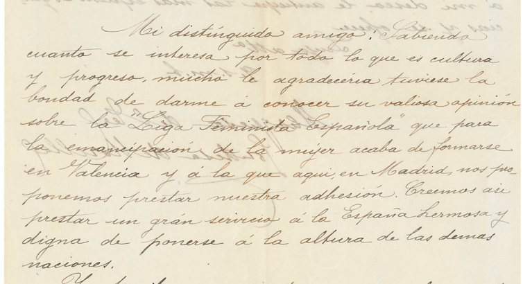 ”(…) Mi distinguido amigo: sabiendo cuanto se interesa por todo lo que es cultura y progreso, mucho le agradecería tuviera la bondad de darme a conocer su valiosa opinión sobre la “Liga Femenina Española” que para la emancipación de la mujer acaba de formarse en Valencia y a la que aquí en Madrid nos proponemos prestar nuestra adhesión. Creemos así prestar un gran servicio a la España hermosa y digna de ponerse a la altura de las demás naciones.“ (Marquesa de Ter)