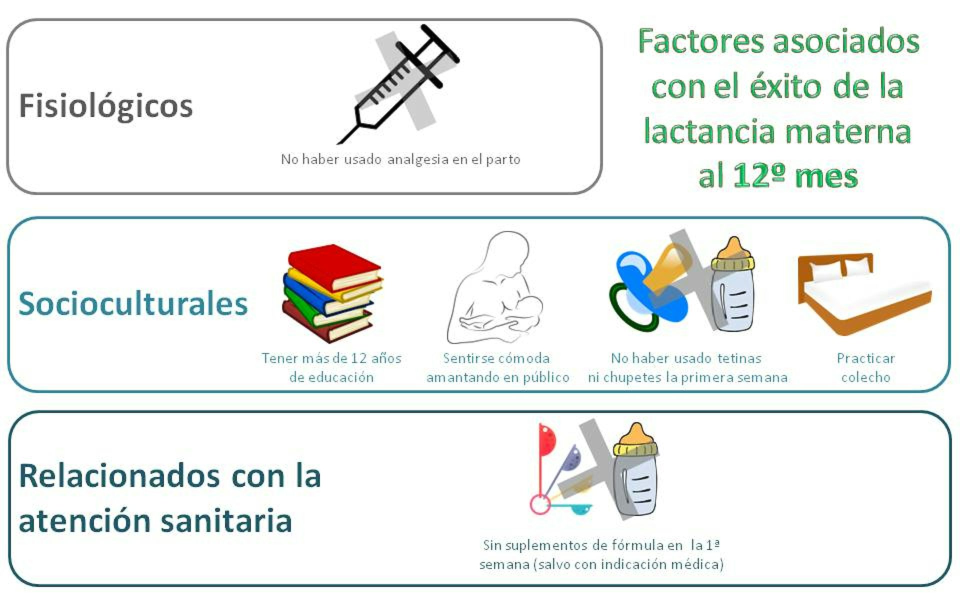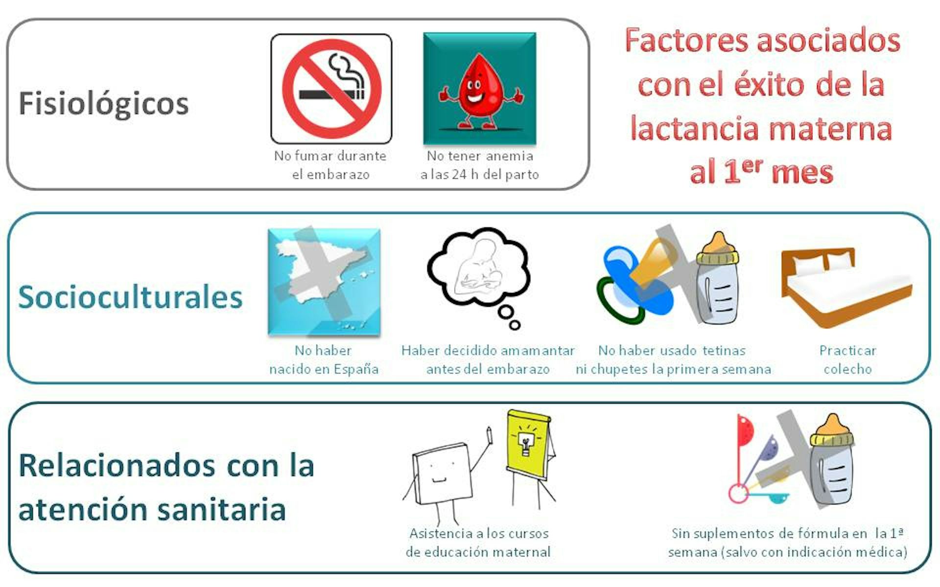 El hecho de no haber nacido en España también favorecía la lactancia en el primer mes, pero no a largo plazo. Finalmente, tenía gran peso en las tasas de lactancia durante el primer mes el que la mujer tomara su decisión de amamantar a un futuro bebé antes de quedar embarazada, que hubiera acudido a las clases de Educación Maternal/paternal impartidas por la matrona de su centro de salud y que practicara colecho.
