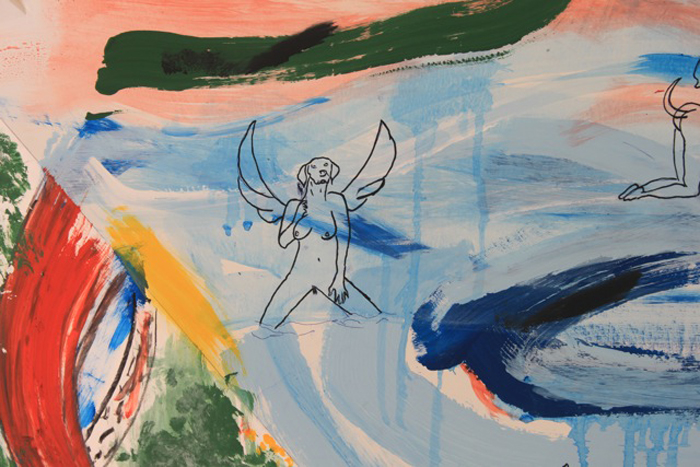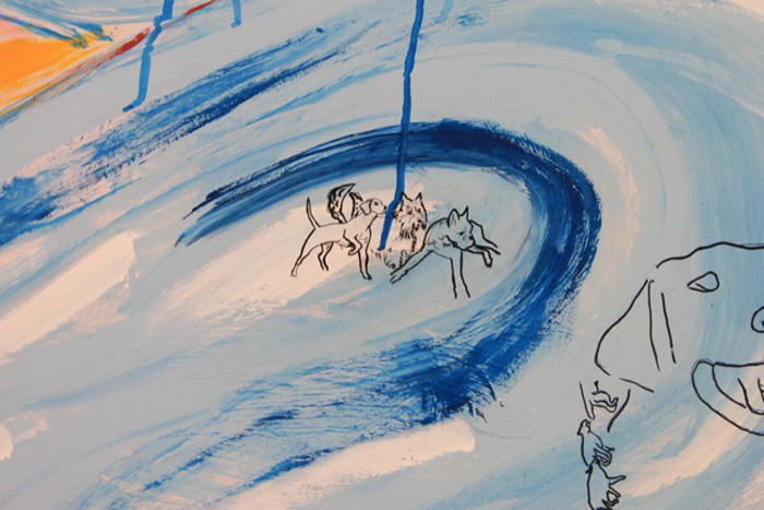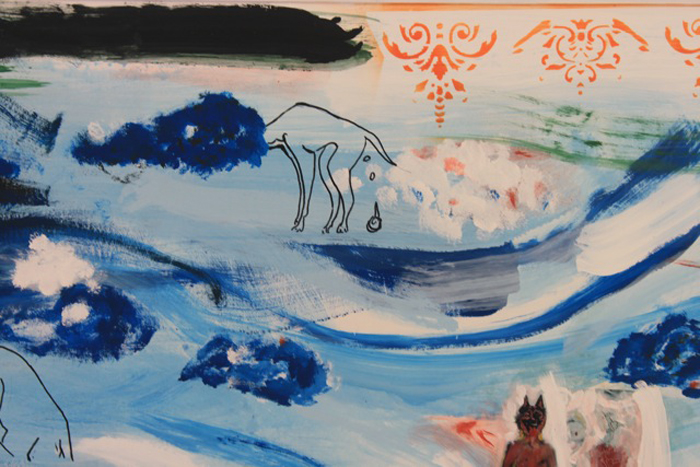 “Todos los días estoy pintando desde la cinco de la madrugada hasta la una de la tarde porque hace un calor enorme, muy superior a los 35 grados, y la pintura que he elegido por las características de la superficie, acrílico, seca más rápido todavía. Hay que limpiar permanentemente los pinceles y no se me puede quedar abierto un envase, porque es fatal”, dice Becerro, quien luego de doce años regresa a la pintura de gran formato, disciplina que había dejado un tanto de lado debido a sus conocidas incursiones en la taxidermia y la escultura en fibra de vidrio.