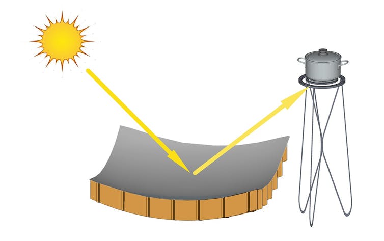 Por último, se pega la superficie reflectante de papel de aluminio. Para utilizar el calentador, se coloca la olla, tetera o cafetera en el plano focal del espejo, como se ve en la Figura 3. La posición relativa de la olla con respecto al espejo deberá reajustarse de acuerdo con el movimiento aparente del sol, de manera de mantener la olla siempre en el plano focal del espejo.