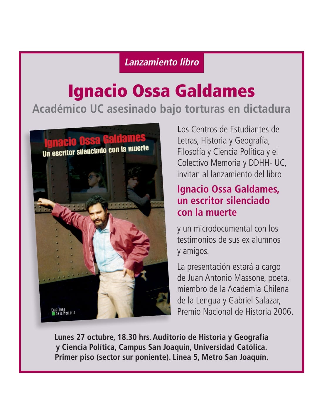 Este lunes 27 de octubre se presentará en la Facultad de Humanidades de la Universidad Católica, campus San Joaquín, la obra de Ignacio Ossa Galdames, académico asesinado bajo torturas en Villa Grimaldi el 25 de octubre de 1975.