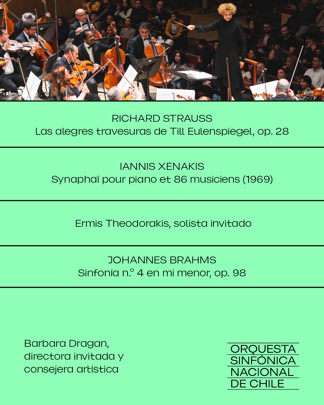 Para cerrar el concierto sonará la Sinfonía n.° 4 de Johannes Brahms. La directora explica: “Después de enfrentar esta increíble experiencia de energía con una orquesta gigante, pasamos a algo más humano, más cercano a la fe humana. La 4ª Sinfonía de Brahms, que nos da más preguntas que respuestas sobre la condición humana, la vida, la fe y la dignidad al enfrentar el destino del individuo”.