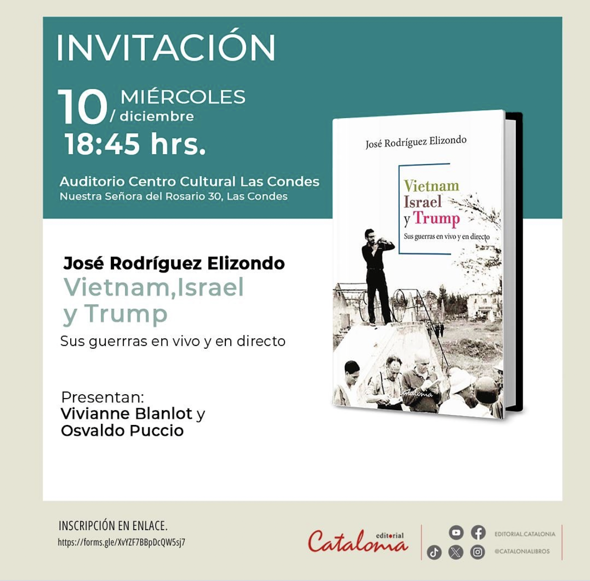 Se trata de “Vietnam, Israel y Trump” (Editorial Catalonia), que será presentado este jueves, a las 18:45 horas, en el Instituto Cultural de Las Condes (Nuestra Señora del Rosario 30), con inscripción previa.
