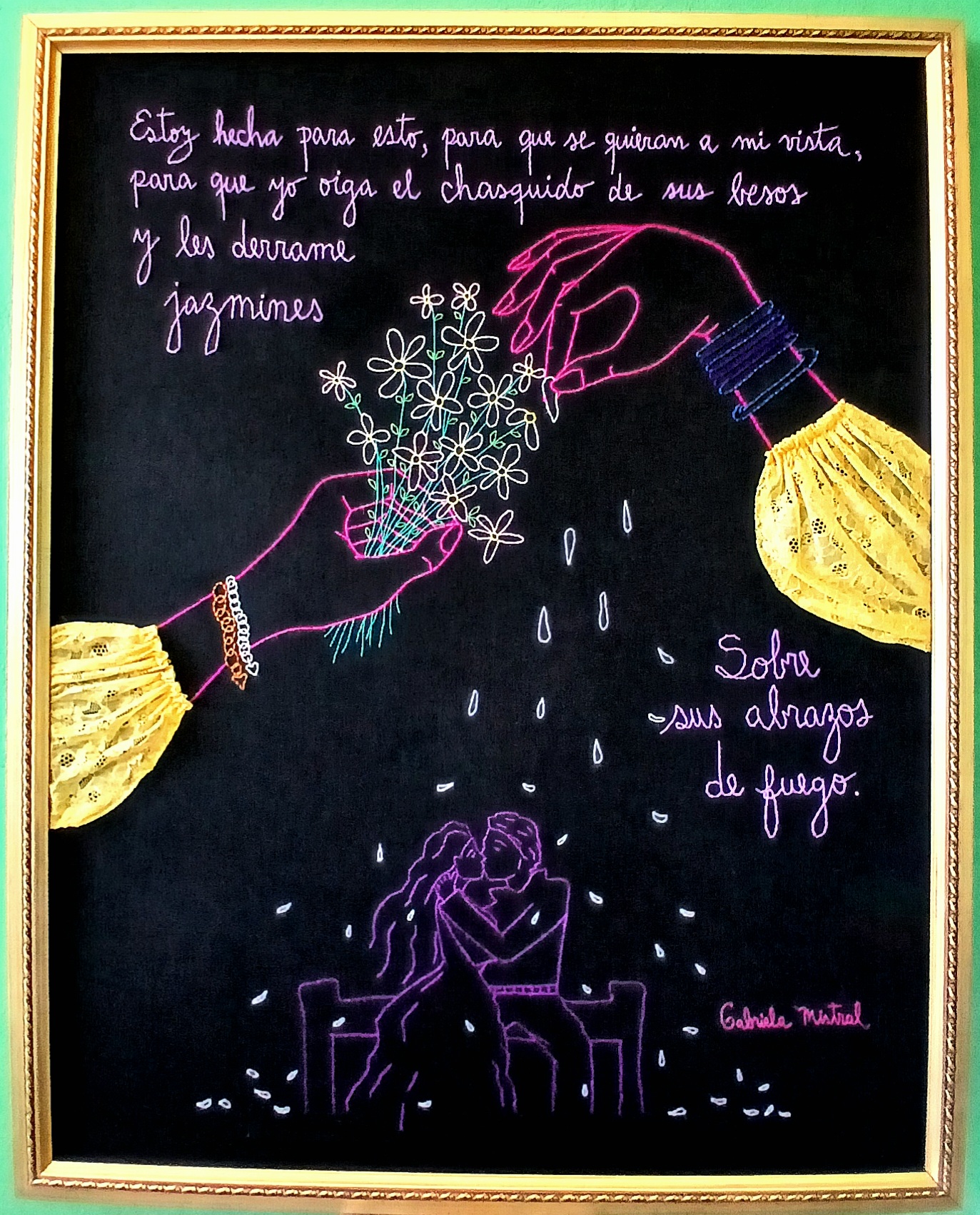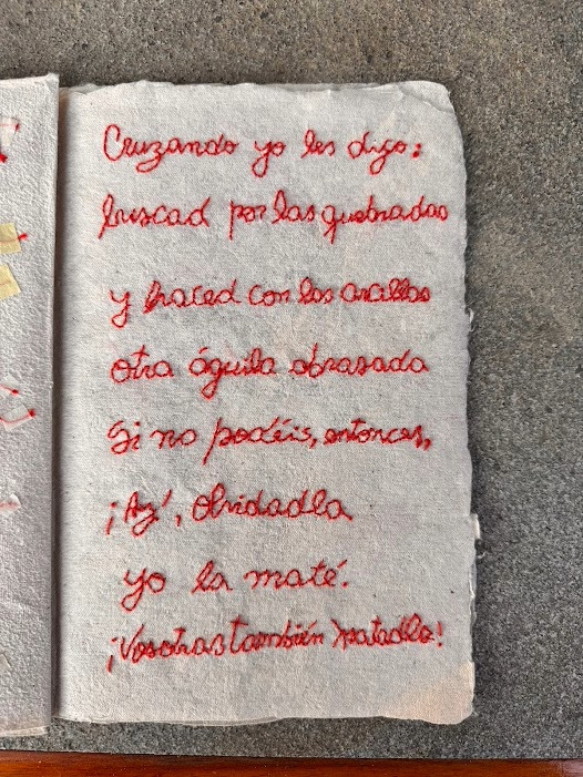 “Solo me queda agradecer a todas las voluntades que, de manera tan generosa, creen en los llamados que se activan desde esta plataforma; a las hermosas redes y afectos que he ganado en el camino, a quienes acompañan con cariño y respeto y, sobre todo, a quienes, con sus acciones, encarnan las convicciones que proclaman sus poderosos bordados. Gracias a ustedes, esta comunidad sigue creciendo, como un grito tejido de artivismos textiles en favor de la cultura de los derechos humanos”.
