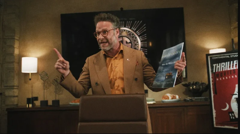 Un hombre habla con los brazos abiertos y un dossier en la mano derecha en lo que parece ser un despacho. A su izquierda se ve un cartel con el texto “Thriller movies”. Fuente de la imagen,Apple TV+