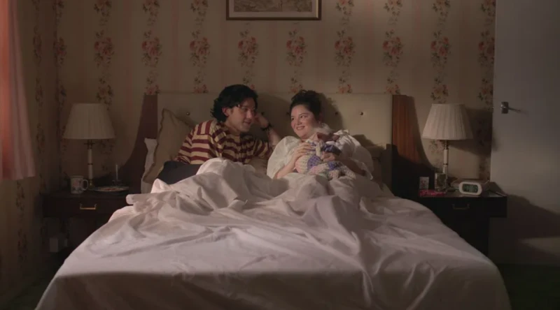 Un hombre (i) y una mujer conversan sonrientes en una cama. Fuente de la imagen,Netflix