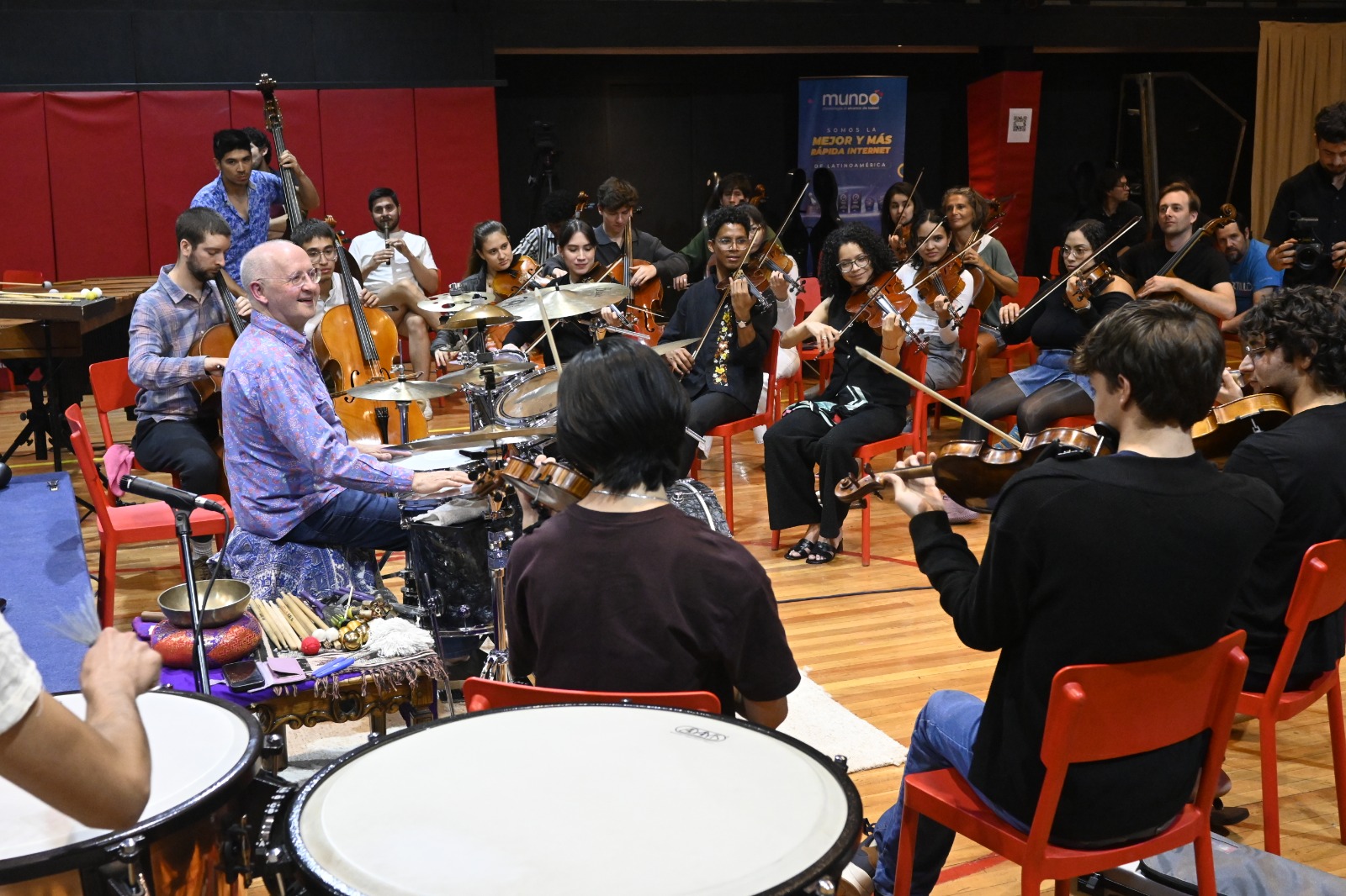 Los músicos van llegando de a poco y se sientan alrededor del baterista David Jones. Acostumbrados a leer partituras, miran al australiano esperando indicaciones. Los más entusiastas son los vientos: toman las sillas rojas, se acomodan, conversan en voz baja. Jones los observa con atención y los invita a abrir el espacio. “Abran el círculo”, dice en inglés.