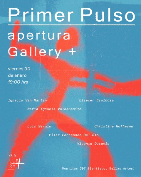 Gallery + representa a siete artistas: Ignacio San Martín, Christine Hoffmann, María Ignacia Valdebenito, Eliecer Espinoza, Vicente Octavio, Luis Sergio y Pilar Fernández del Río, convocándoles en esta primera instancia en la inauguración de la exposición colectiva “Primer pulso” que significará al mismo tiempo la primera apertura del espacio.
