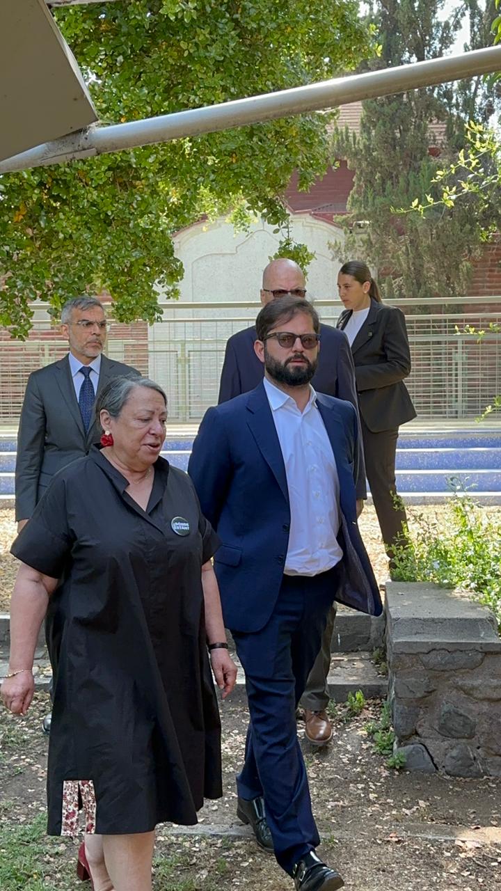 En compañía de la directora del INDH, Consuelo Contreras, el Presidente de la República, Gabriel Boric, llega al Parque por la Paz Villa Grimaldi en Peñalolén para asistir a la entrega del Informe Anual Situación de los DD.HH. en Chile 2023. Crédito: INDH