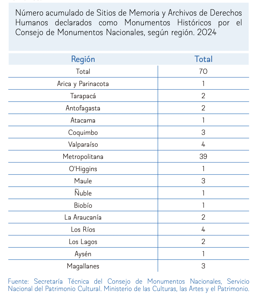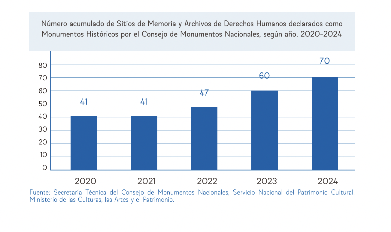 La categoría Sitios de Memoria es la que representa la mayoría de los casos dentro de los Monumentos Históricos declarados, con un total de 60 sitios. También hay presencia de Archivos de Derechos Humanos, que cumplen un rol clave en el resguardo del acervo documental, los cuales están concentrados solo en la Región Metropolitana (10 registros).